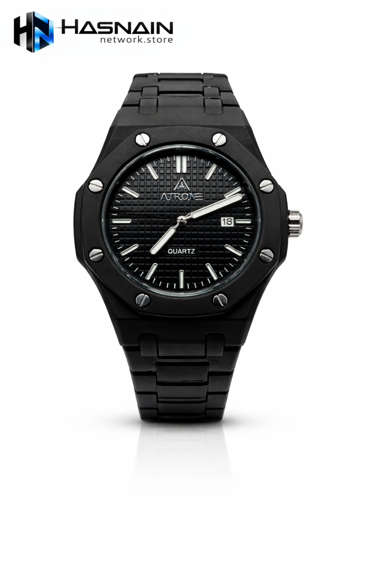 Designed for active lifestyles, the Aurore black sport watch features a strong case design with screw-style accents, a textured dial, and clear luminous hands. It includes a date window and accurate quartz movement, making it practical and stylish for everyday and sports wear.