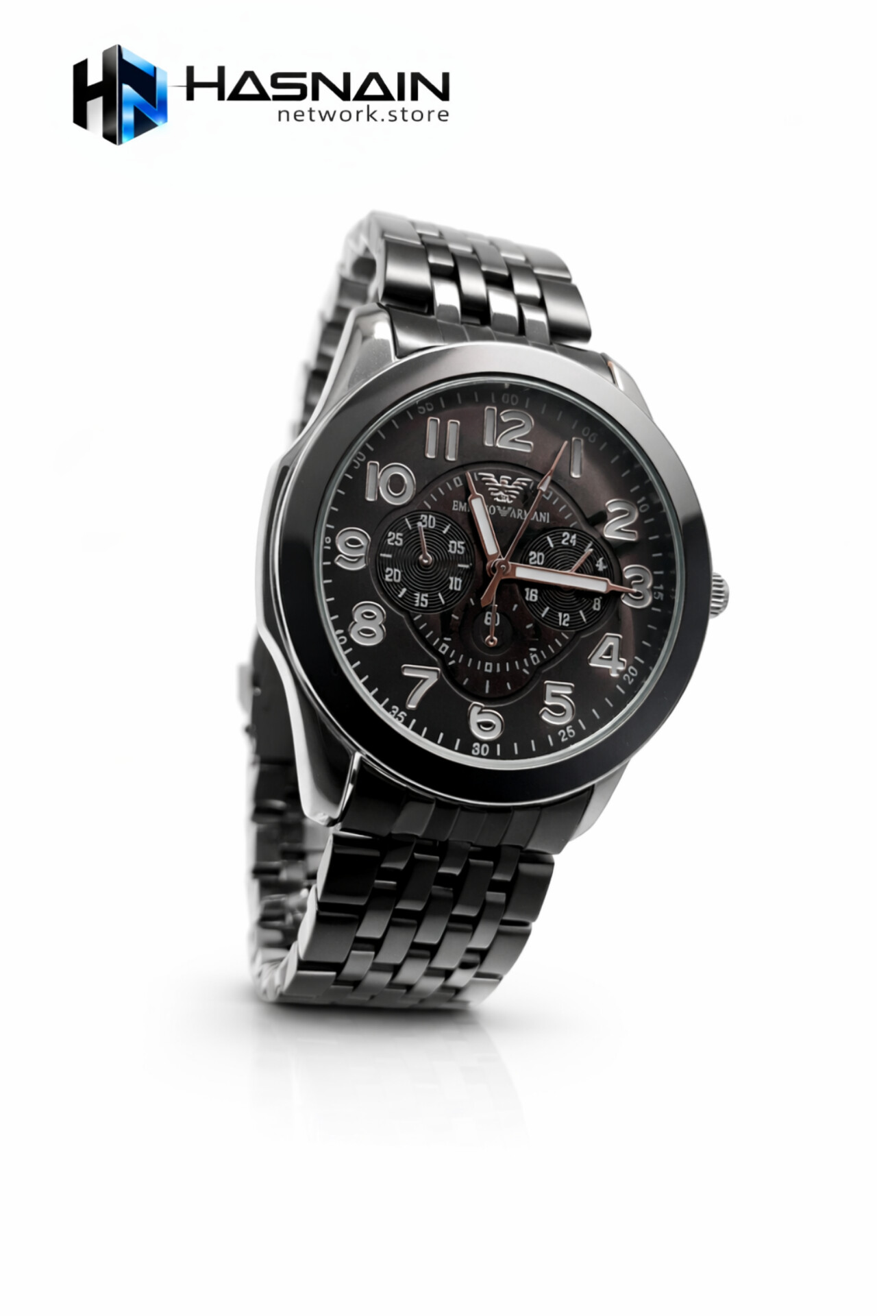 Black watch with bold numerals and chronograph-style multi-dial face.