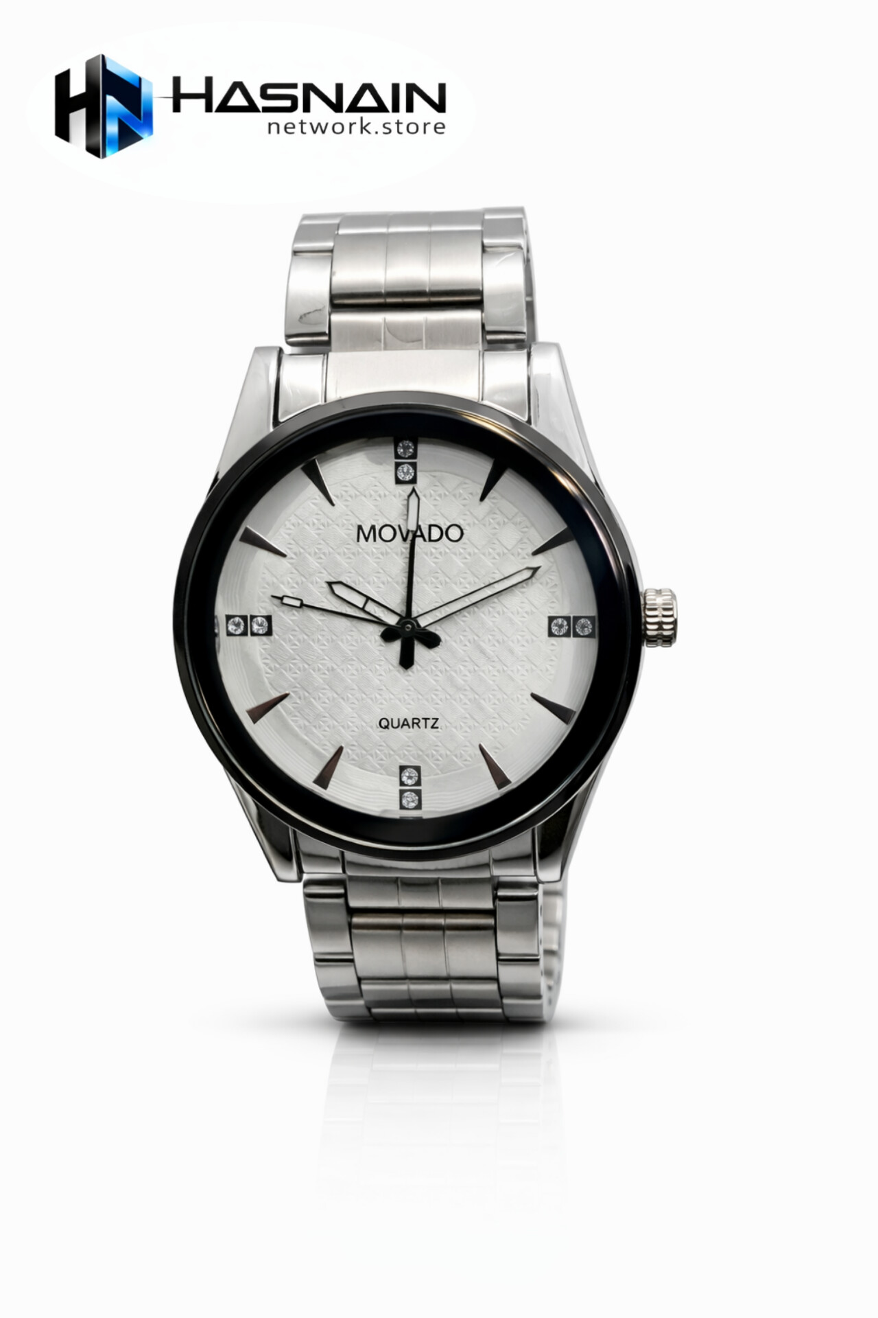 Movado Silver Quartz Classic Watch ek refined aur luxury-inspired timepiece hai jo minimal design aur premium finishing ke liye jani jati hai. Is ka textured white dial black bezel ke sath bohat elegant contrast create karta hai, jabke crystal-style hour markers isay sophisticated look dete hain. Strong stainless-steel strap daily wear ke liye durable hai aur formal outfits ke sath bhi perfect match karta hai. Accurate quartz movement reliable performance deta hai. Yeh watch un logon ke liye ideal hai jo simple, classy aur branded-style watches pasand karte hain.