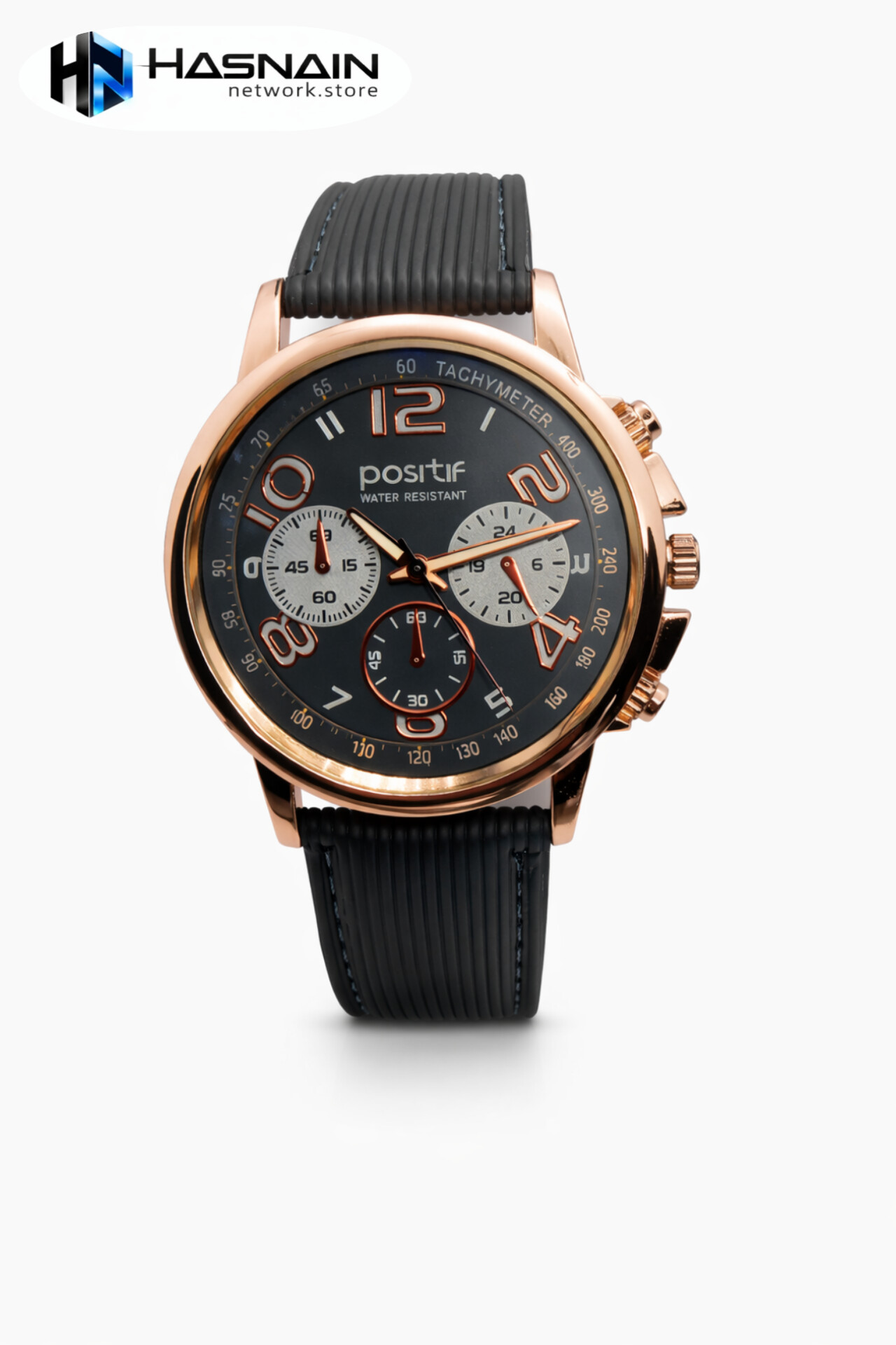 This Positif wristwatch features a bold black dial with rose-gold accents and chronograph-style sub-dials for a premium sporty look. It includes a tachymeter scale on the bezel ring and a comfortable ribbed rubber strap designed for daily use. The watch is water-resistant and powered by reliable quartz movement, making it suitable for casual wear, office wear, and outdoor activities. A perfect blend of style and durability.