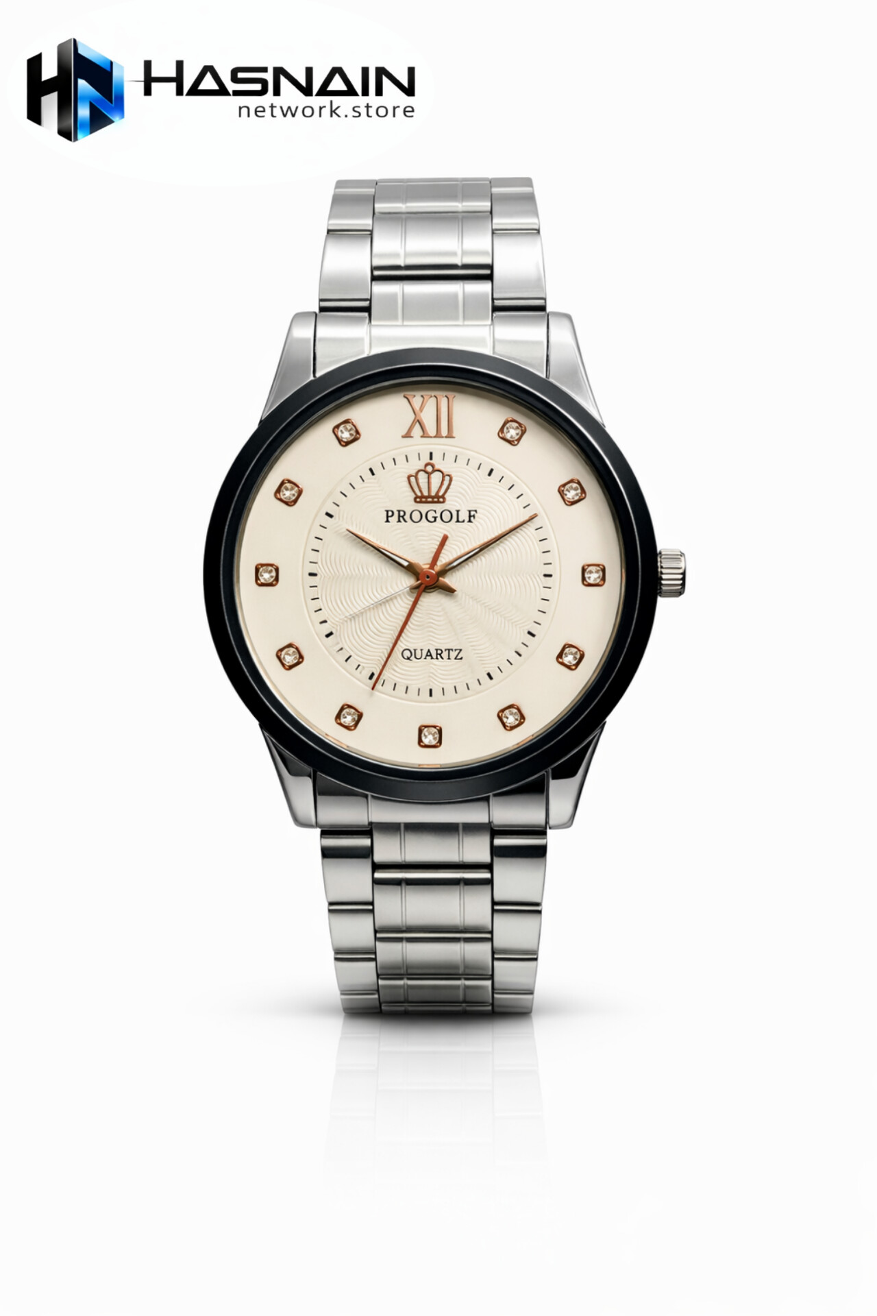 This refined ProGolf watch comes with a silver stainless-steel strap and a light dial featuring golden crystal markers and crown logo styling. Suitable for wedding wear, business attire, or daily classy looks, this watch delivers elegance with durability.